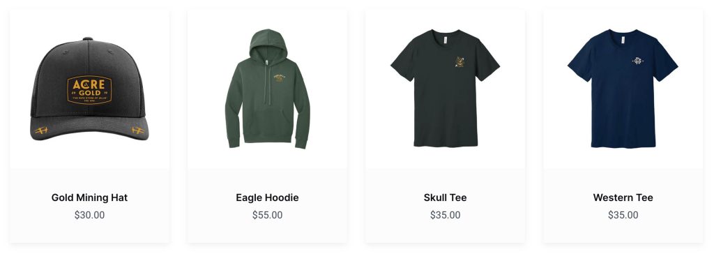 You’ll find the signature Gold Mining Hat priced at $30, the premium Eagle Hoodie at $55, and expressive t-shirt designs including the Skull and Western varieties at $35 each.