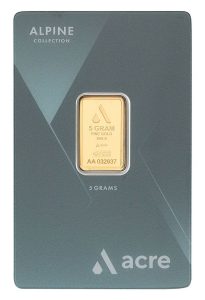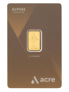 The 2.5-gram gold bars belong to Acre Gold’s distinguished Alpine Collection. Each bar features a distinctive Acre logo design and comes secured in protective packaging.