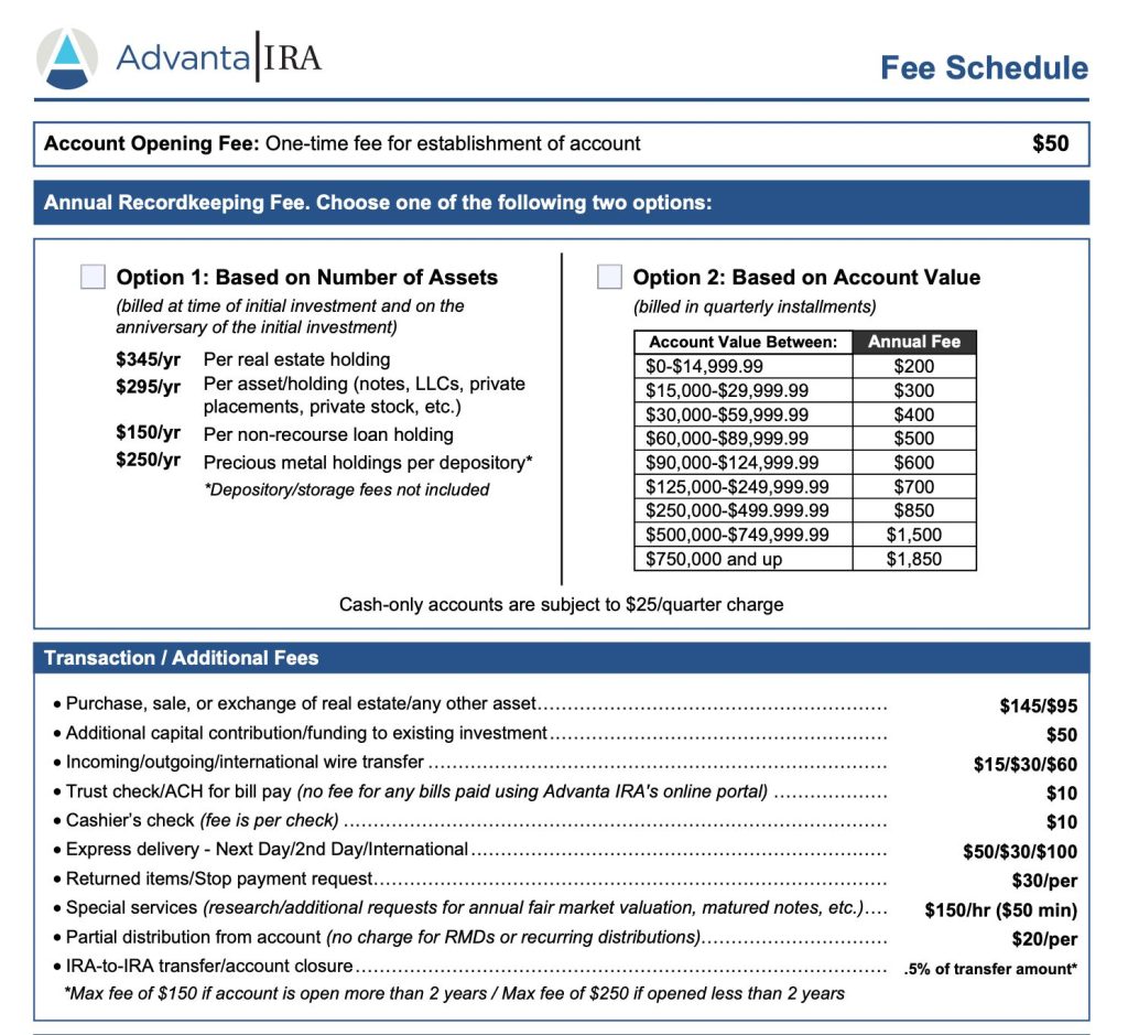 The account setup process starts with a one-time $50 fee that gets your self-directed IRA operational. For cash-only accounts you’ll pay $25 quarterly which totals $100 annually.
