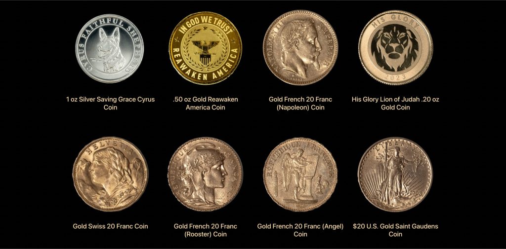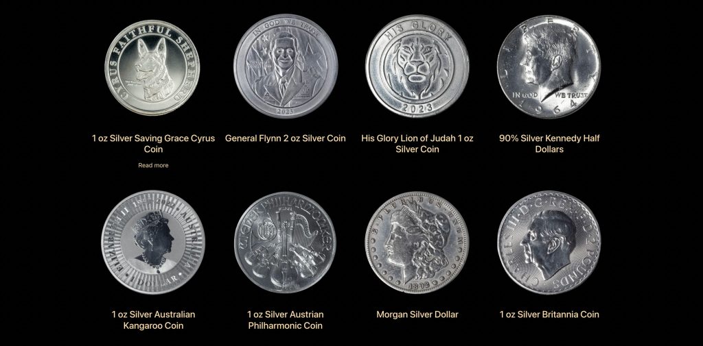 The Silver Coins collection features notable pieces including the 1 oz Silver Saving Grace Cyrus Coin, and Lion of Judah coin, plus international options such as Australian Kangaroo and Austrian Philharmonic.