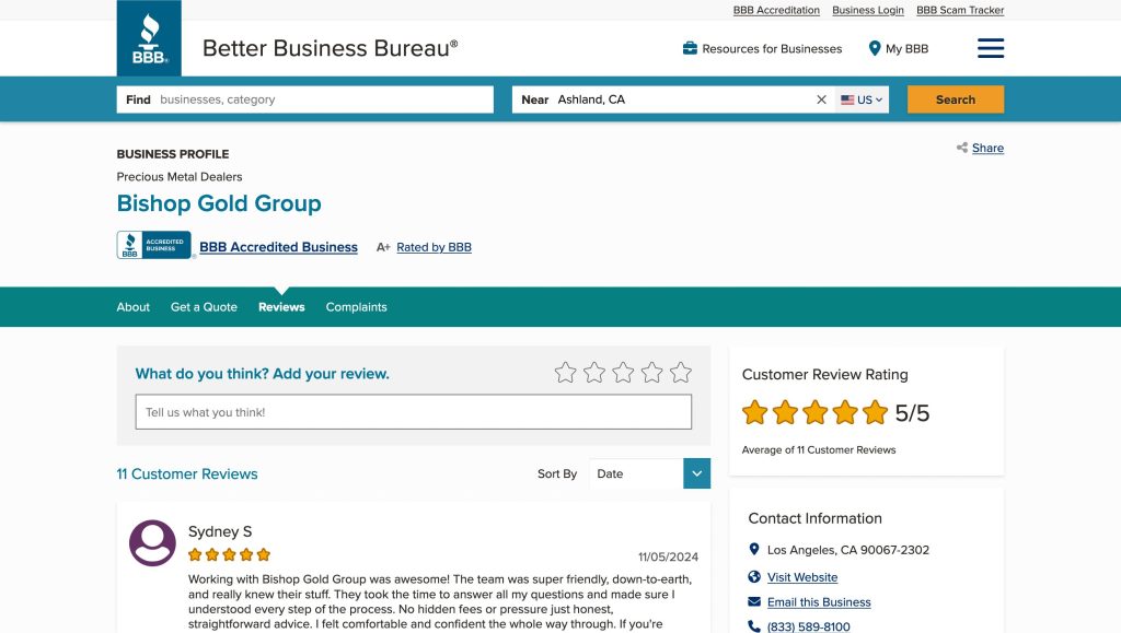 - BBB (Better Business Bureau): Bishop Gold Group maintains an outstanding A+ rating and achieves a perfect 5/5 score from 15 reviews on BBB. This demonstrates their commitment to customer satisfaction and business excellence.
