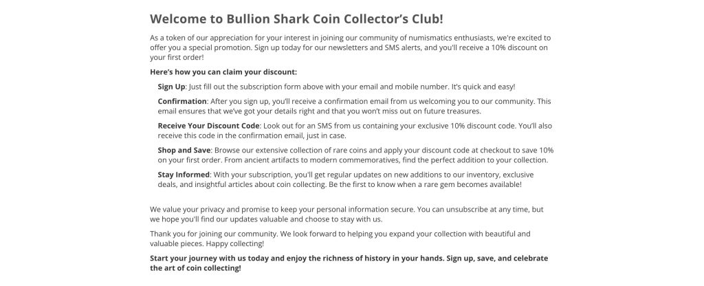 The Bullion Shark Coin Collector’s Club offers an exclusive opportunity for new members with a valuable 10% discount on initial purchases.
