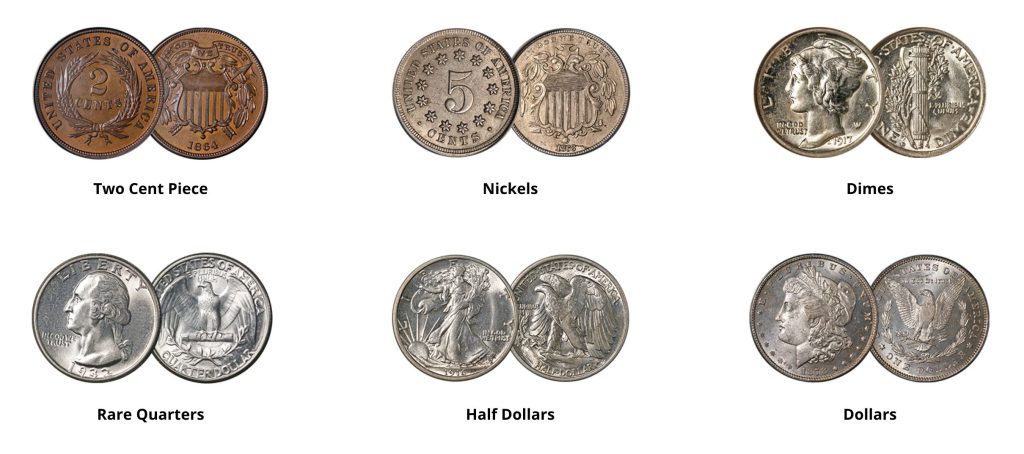The collection features the Two Cent Piece, notable for introducing “In God We Trust,” alongside various Nickels and Dimes reflecting American monetary evolution.