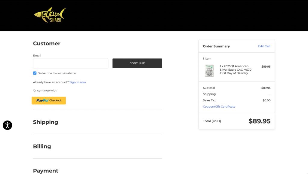 - Select Your Products: Browse through Bullion Shark’s website inventory and add desired items to your cart. Note that they may not specialize in IRA-approved metals as there’s no dedicated section.