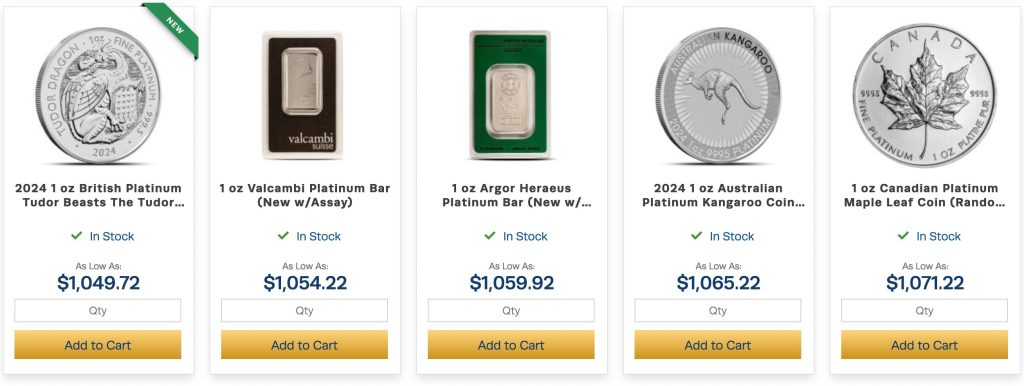 Gold Bullion Bars offer straightforward investment options in various weights. Depending on size and market rates, prices range from $2,000 for smaller bars to $60,000+ for larger options.