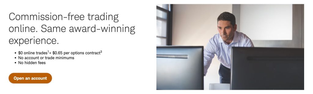 Stock and ETF trades cost $0 when you execute them online through Schwab’s platforms. Options trading carries no base commission but adds $0.65 per contract—meaning a 10-contract trade costs $6.50 total. We discovered OTC equity trades break this pattern at $6.95 per transaction.