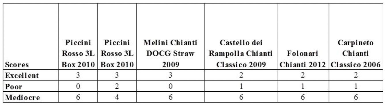 So in Table 2, we count the number of times each wine got an excellent (90+), a poor (<71) and a mediocre (89–71) score. The “tails” results are not impressive. All wines got high mediocre scores with the exception of the second glass of Piccini. But that glass got a lower mediocre score only because two tasters scored it “poor”.