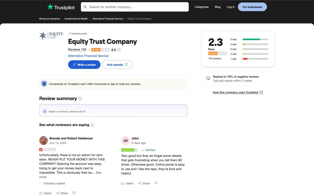 Aggregated ratings from various sources range from 0.9/5 to 3.8/5, indicating inconsistent customer experiences. Even though these mixed reviews, Equity Trust ranks 4th among the top 10 self-directed IRA custodians, suggesting competitive features offset service shortcomings for many investors.