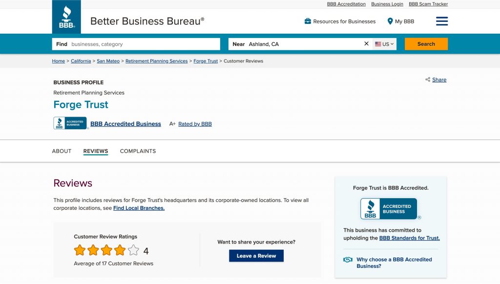 The BBB rates Forge Trust 4 out of 5 stars based on 17 reviews. Customer service receives consistent praise for knowledgeable staff and platform usability.