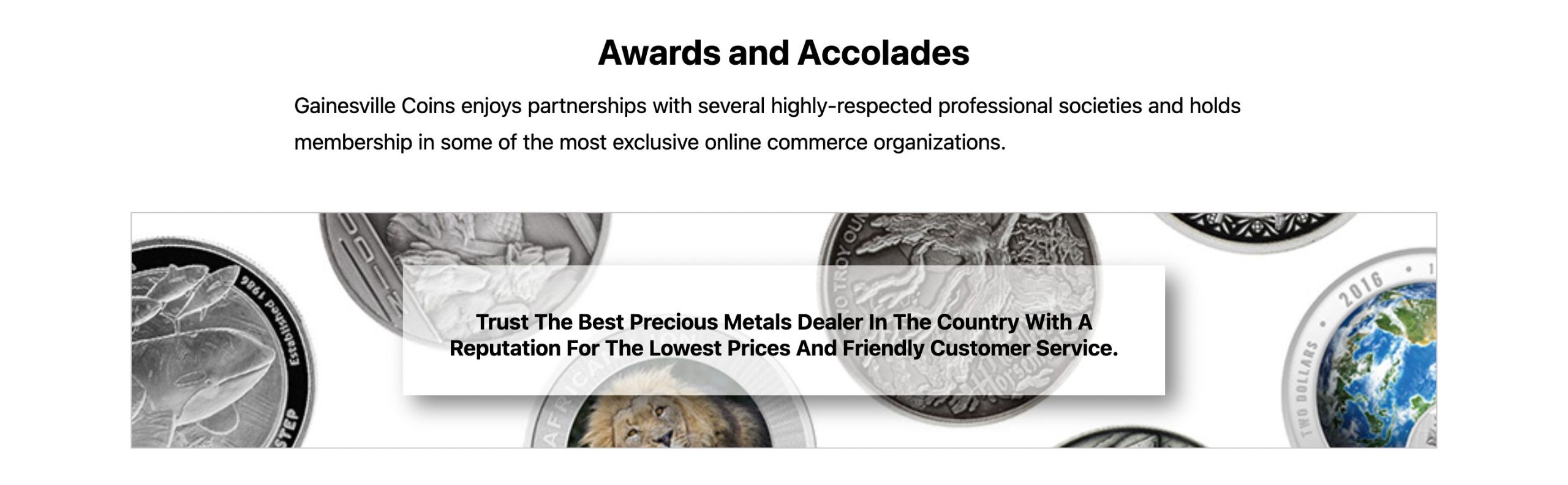 Gainesville Coins distinguishes itself through strategic partnerships with prestigious professional organizations and memberships in select e-commerce associations.