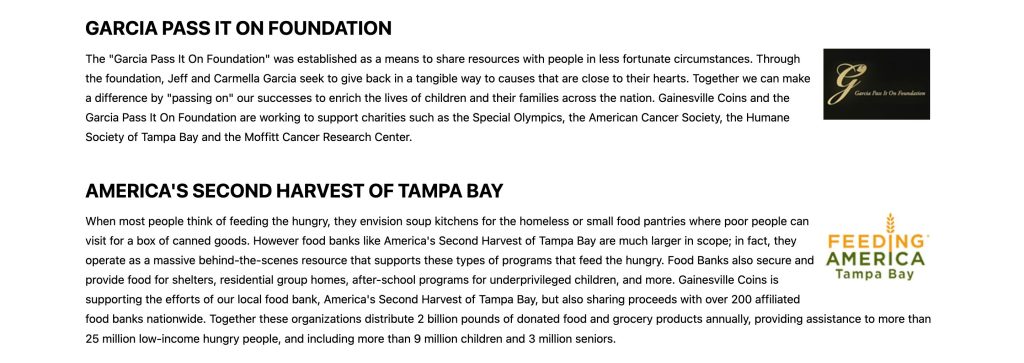 America’s Second Harvest of Tampa Bay stands as a prominent food bank addressing hunger issues. Gainesville Coins extends support to this organization along with 200 other food banks across the nation.