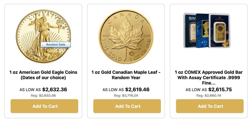 You’ll find their gold collection particularly appealing if you’re looking to invest in precious metals. The 1 oz American Gold Eagle Coin stands out at $2,594.66, with pricing variations based on your selected date.