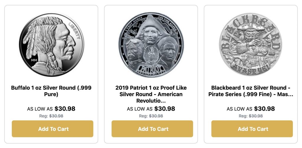Notable mentions include the Noah’s Ark 1 oz Silver Round (.999 Pure) and 1 oz Trident Silver Round – Thalassa (.999 Fine), both from Mason Mint and priced at $30.16.