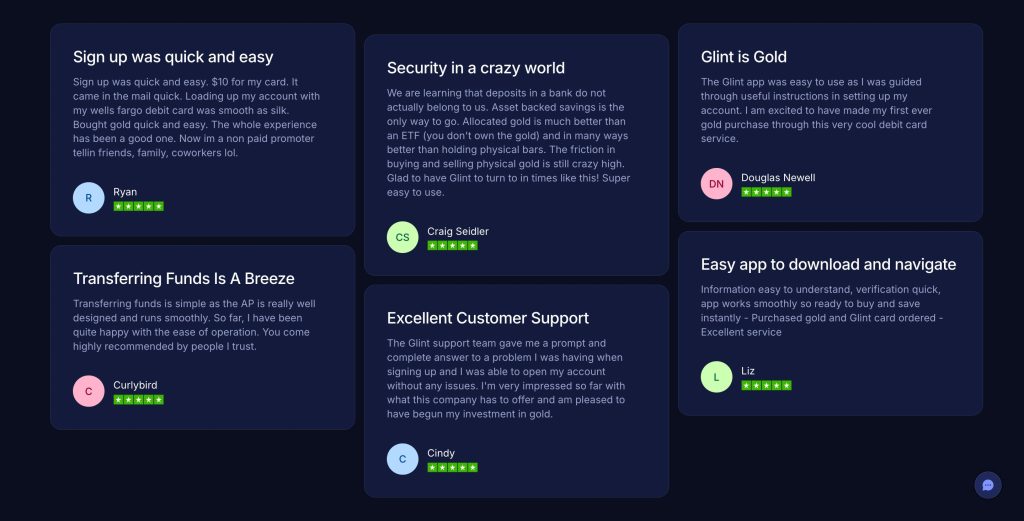 Users consistently praise Glint Pay’s reliability, convenience for gold investments, robust security measures, intuitive design, and outstanding customer service.