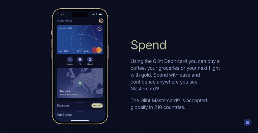 The platform combines traditional gold ownership with modern convenience, enabling users to purchase, store, transfer, and utilize gold as currency. Through their integrated app and Glint Mastercard®, the system provides seamless financial management.