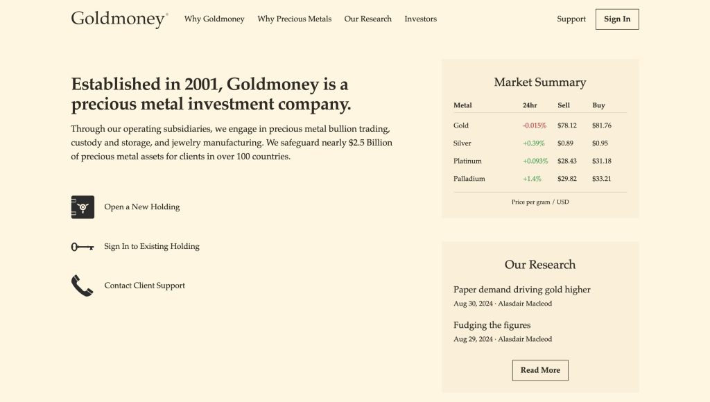 Goldmoney stands as a superior platform for purchasing, selling, and safeguarding precious metals. This service provides more than just metal transactions; it delivers comprehensive security and exceptional customer support that enhances your investment experience.