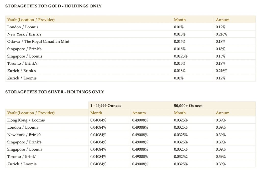 Gold storage fees range from 0.01% to 0.018% monthly, which amounts to 0.12% to 0.216% yearly, depending on your chosen vault location.
