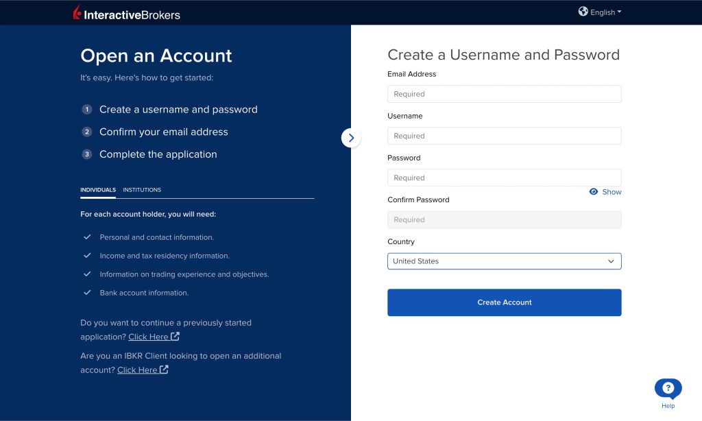 The process starts at the Interactive Brokers website where you click “Open Account” and enter your email, username, and country.