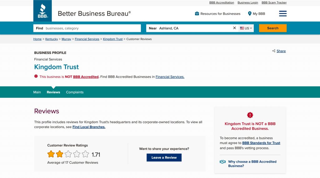 Kingdom Trust maintains an A- Better Business Bureau rating even though not being BBB accredited. But, customer reviews paint a mixed picture with 1.7 out of 5 stars from 17 reviews. Recent complaint numbers show 14 filed over three years and 2 within the last 12 months.