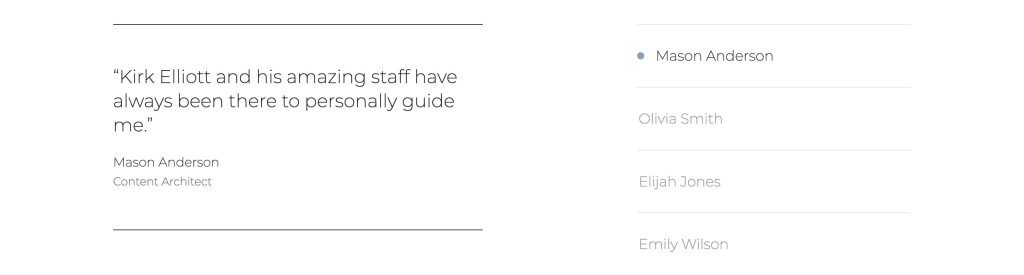 • Olivia Smith (Development Engineer): “I’ve trusted Dr. Kirk Elliott for over 25 years. I tell my friends and family to work with him too.”