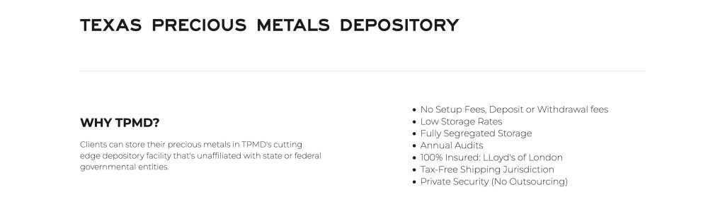 TPMD doesn’t charge any fees to set up, store, or take out your metals, making it a cheap option. They also keep your metals separate and fully insured, checking everything every year, and you don’t have to pay extra taxes when you ship your metals to them.