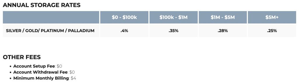 These low rates include fully separate storage for each client’s metals, meaning your items are not mixed with others’. The lowest monthly charge is only $4.