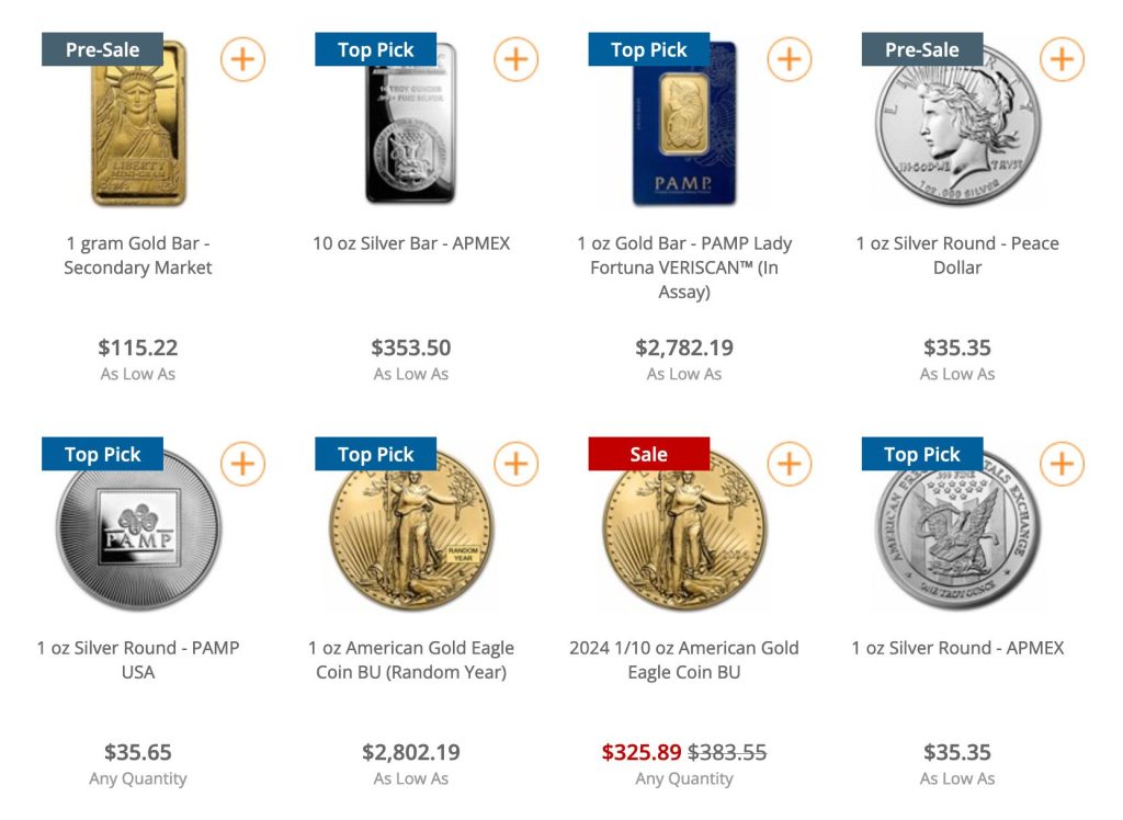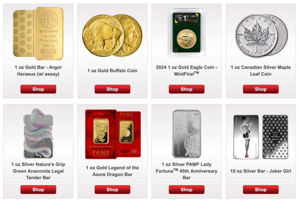 - Various Metal Options: Features gold coins, bundled gold offerings, silver bars, and unique coin selections.