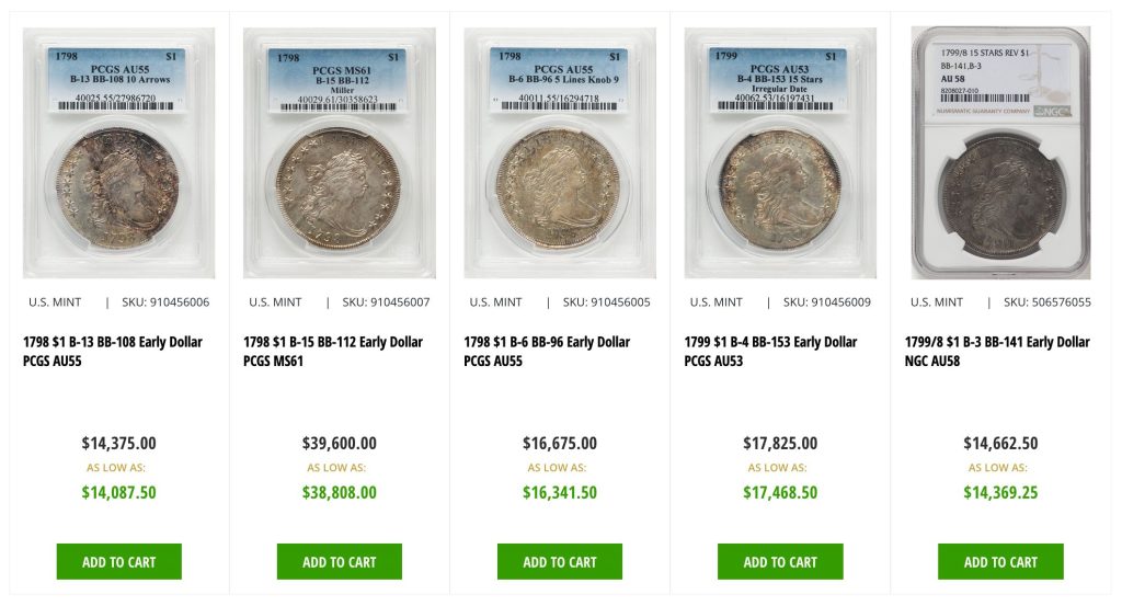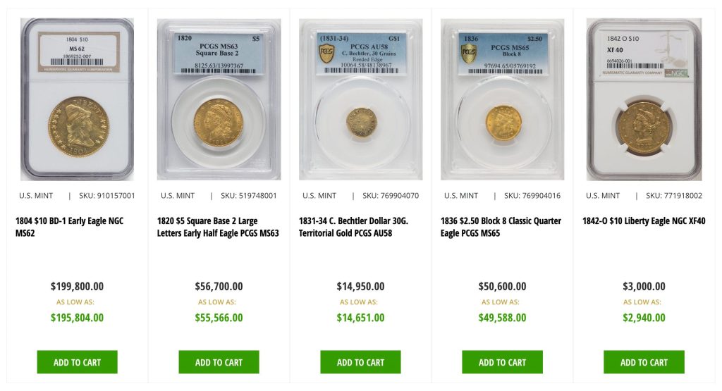 Their remarkable inventory features notable pieces such as the 1801 $10 Early Eagle, graded MS62, priced at $42,350, with a discounted option of $41,503. The prestigious 1804 variant commands $199,800, though you might secure it for $195,804.