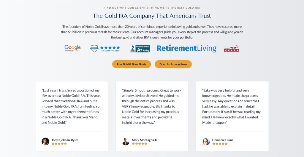 - Better Business Bureau (BBB): A+ rating and 4.97/5 starts from over 203 reviews – This is the best possible rating and shows Noble Gold tries hard to solve any customer problems and do business fairly.
