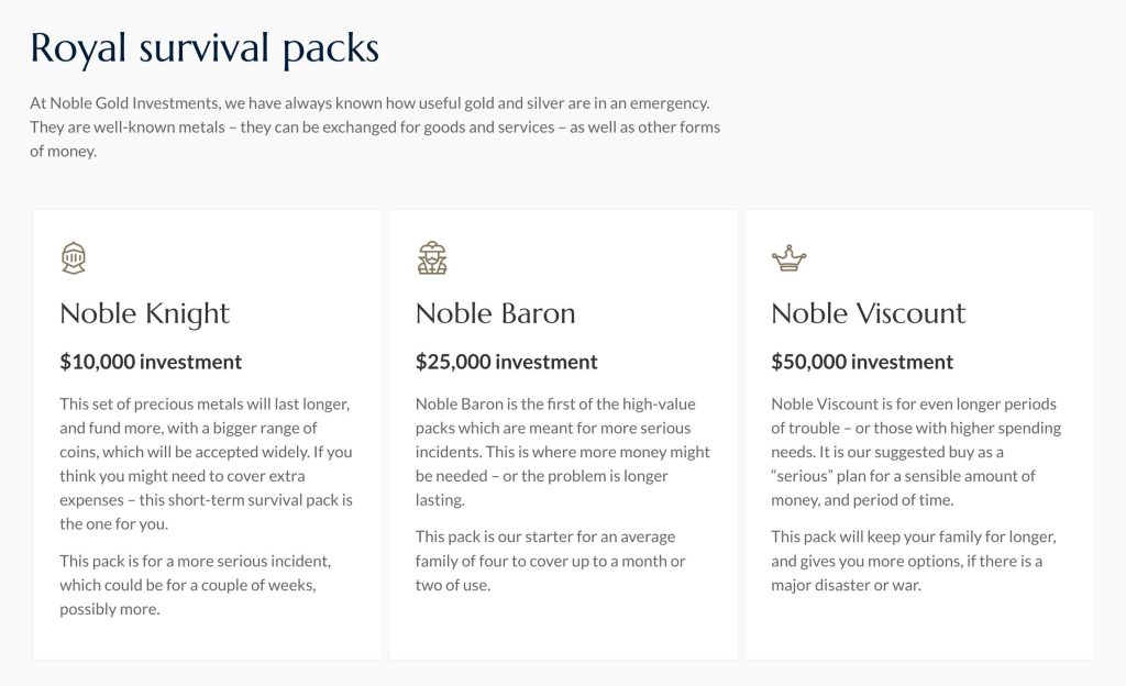 Royal Survival Packs usually have a mix of gold and silver coins or bars, chosen to give you both value and the ability to sell quickly if needed.