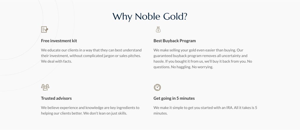 - Ongoing Help: Noble Gold will keep giving you updates and support for your investment. You’ll have your own representative you can ask questions or talk to if you’re worried about anything.