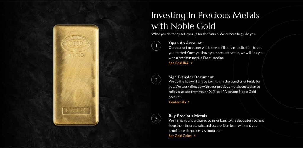 Noble Gold Investments offers a streamlined approach to precious metals investing. Begin your journey by exploring their comprehensive website, which details their offerings in gold, silver, and IRA options.