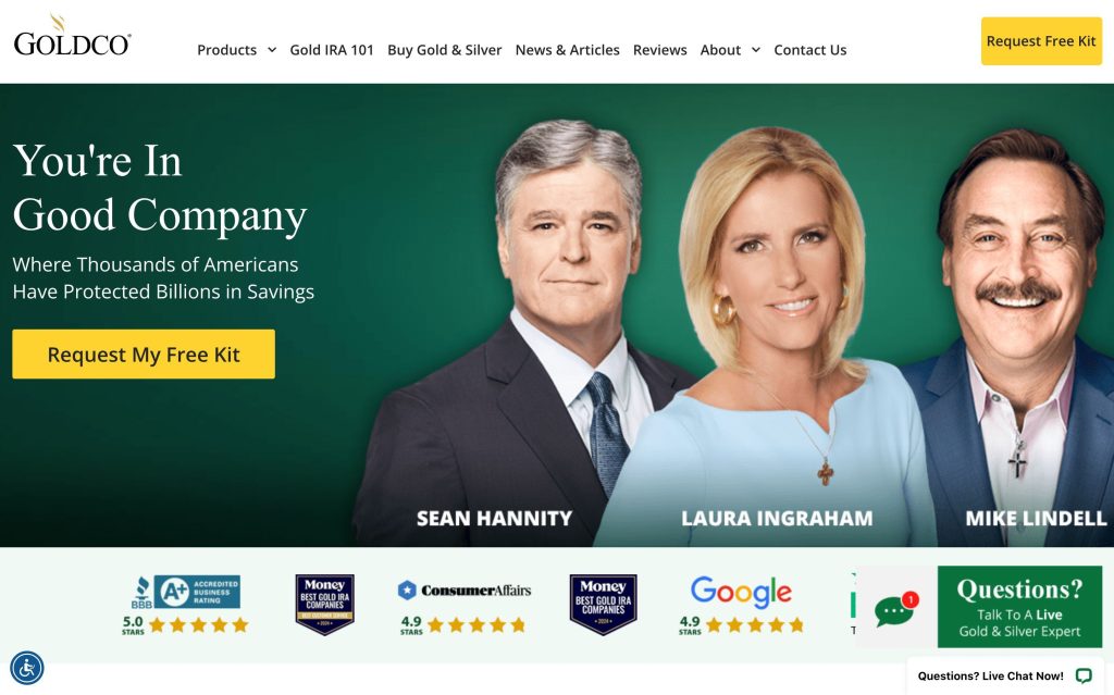 • Ratings and Reviews: Goldco has an A+ rating with the Better Business Bureau and consistently gets positive reviews on Trustpilot. Several well-known people in the financial world have also endorsed them.