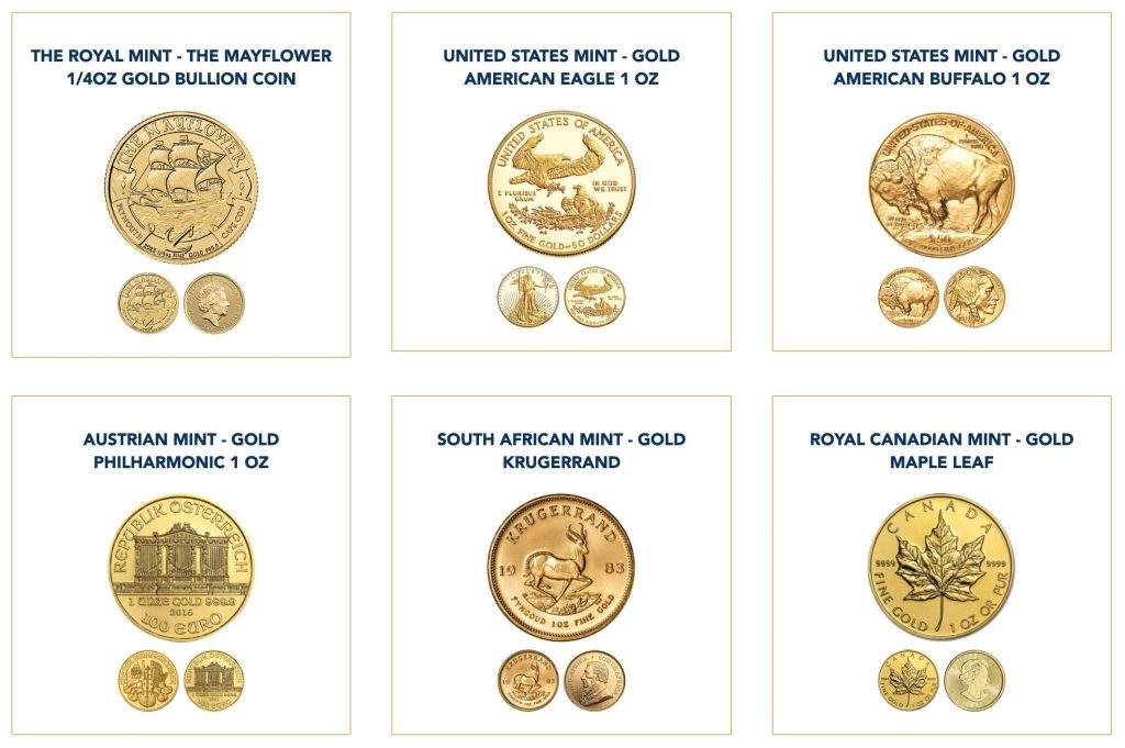 Their product lineup includes gold sales with an extensive selection of coins and bullion, featuring: