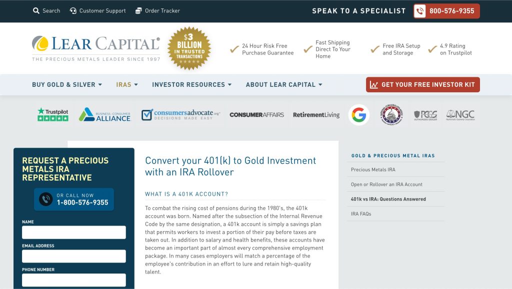 Lear Capital offers comprehensive educational resources explaining the benefits of precious metals investment. You can initiate the process by accessing their website.