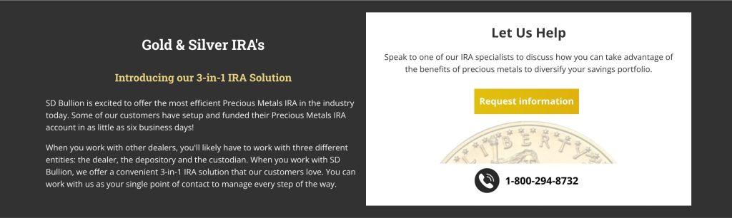 SD Bullion offers special Gold and Silver IRA services for people who want to add gold and silver to their retirement savings.