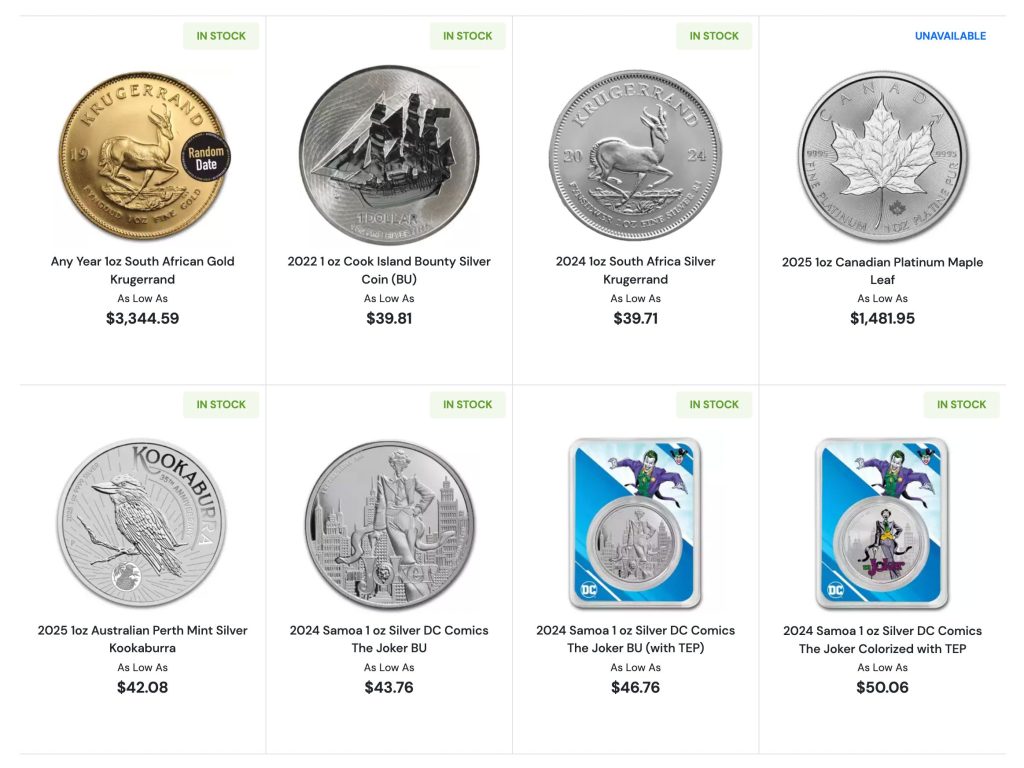 Silver investors get equal variety. American Silver Eagles lead the lineup alongside Canadian Maple Leafs, Australian Kangaroos, and British Britannias. You’ll spot 10-ounce, 100-ounce, and 1,000-ounce silver bars for bulk purchases.