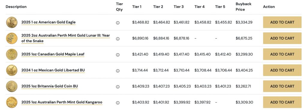 You’re looking at gold coins from six continents when you browse their selection. American Gold Eagles, Canadian Maple Leafs, South African Krugerrands, Australian Kangaroos, and Mexican Libertads fill their displays. Gold bars come in 1-ounce, 10-ounce, and 1-kilogram sizes from established refiners.