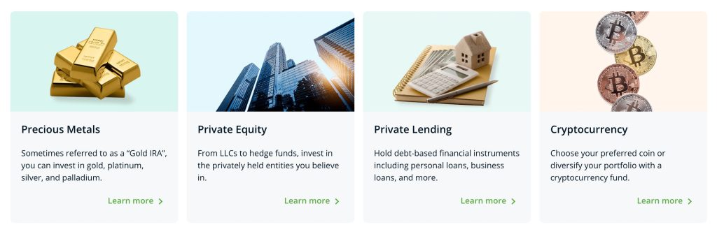 - Extensive Investment Selection: You gain access to real estate, precious metals, private equity, cryptocurrency, and dozens of other alternative assets beyond traditional stocks and bonds.