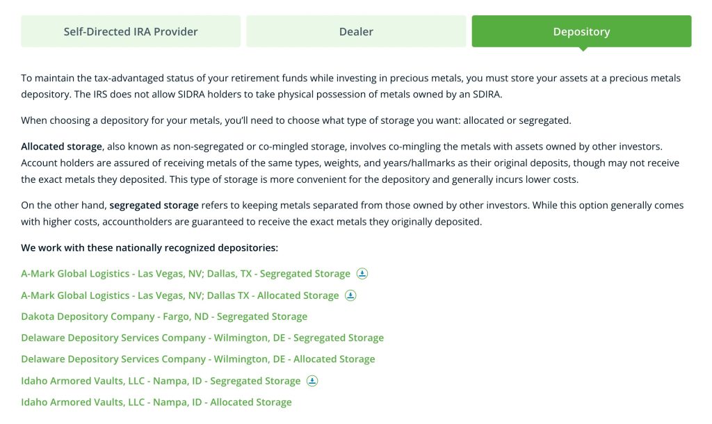 Your precious metals are stored through partnered depositories including CNT Depository, Dakota Depository Company, Delaware Depository, and Idaho Armored Vaults, LLC—all state-licensed facilities with regular financial audits and insurance coverage protecting your assets.