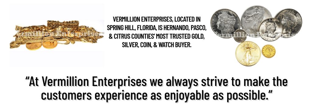 You walk through Vermillion Enterprises’ door carrying your grandmother’s gold jewelry collection. The staff evaluates each piece while you watch, explaining current market values for 14k and 18k gold. You receive a quote based on spot prices and the items’ condition.