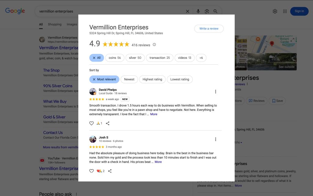 You’re scrolling through precious metals dealers when Vermillion Enterprises catches your eye with its 4.9-star Google rating.